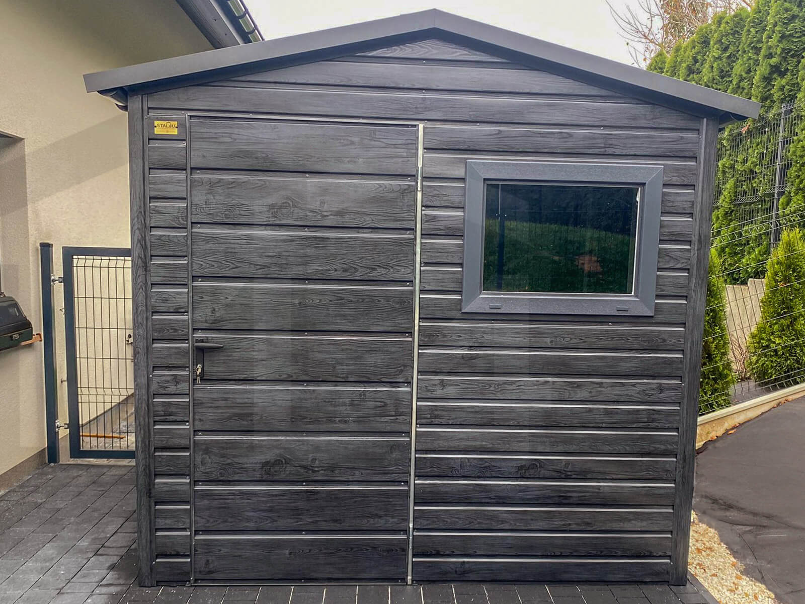 Otrzymujesz kompletny produkt: konstrukcję stalową, poszycie w kolorze Grafit Drewnopodobny i Czarny Mat, drzwi z zamkiem, okno uchylne, kratkę wentylacyjną, orynnowanie PCV z rurami spustowymi oraz zestaw obróbek blacharskich.