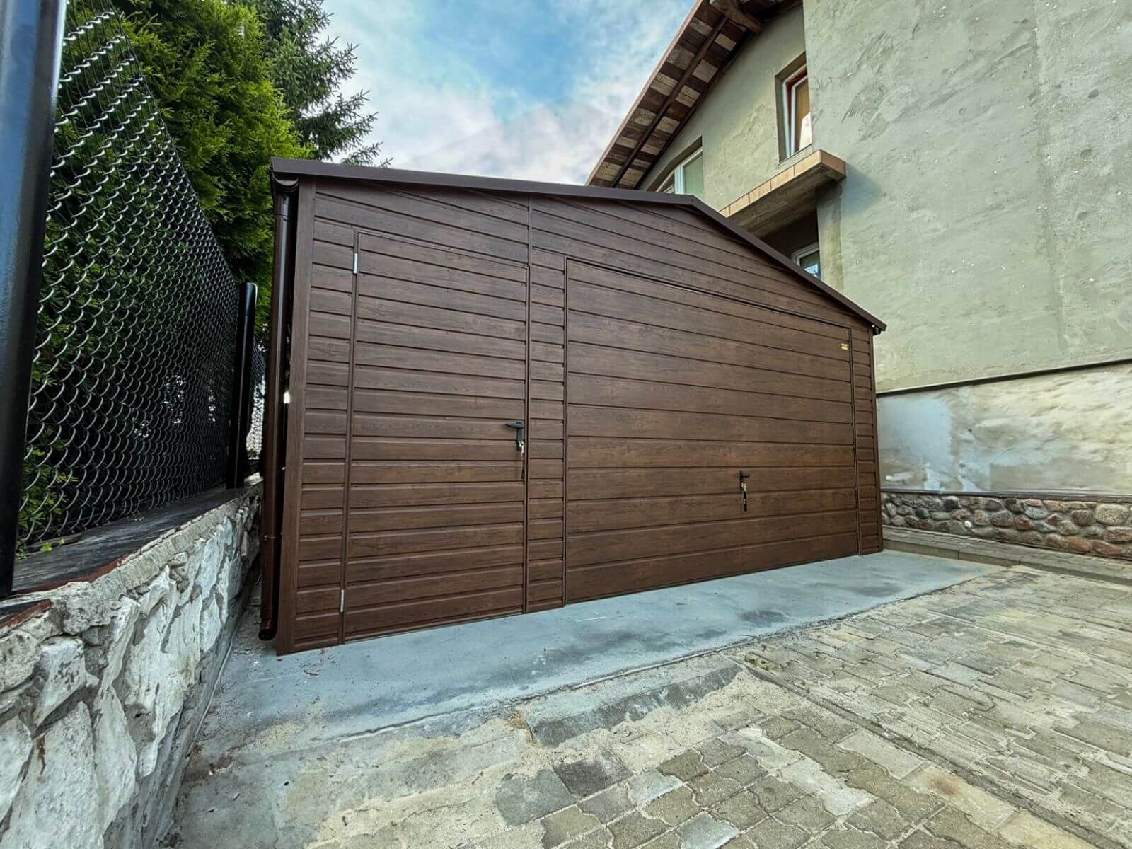 Ten garaż dwuspadowy to rozwiązanie dla osób, którym standardowe wymiary nie wystarczają. Imponująca długość 11 metrów przy szerokości 5 metrów daje aż 55 m² powierzchni. To pozwala na swobodne parkowanie samochodu (nawet dostawczego) i zaaranżowanie w głębi potężnego warsztatu, siłowni lub magazynu. Całość wykonana w estetyce Premium: drewnopodobny Orzech na ścianach idealnie komponuje się z dachem w kolorze Brąz Mat.